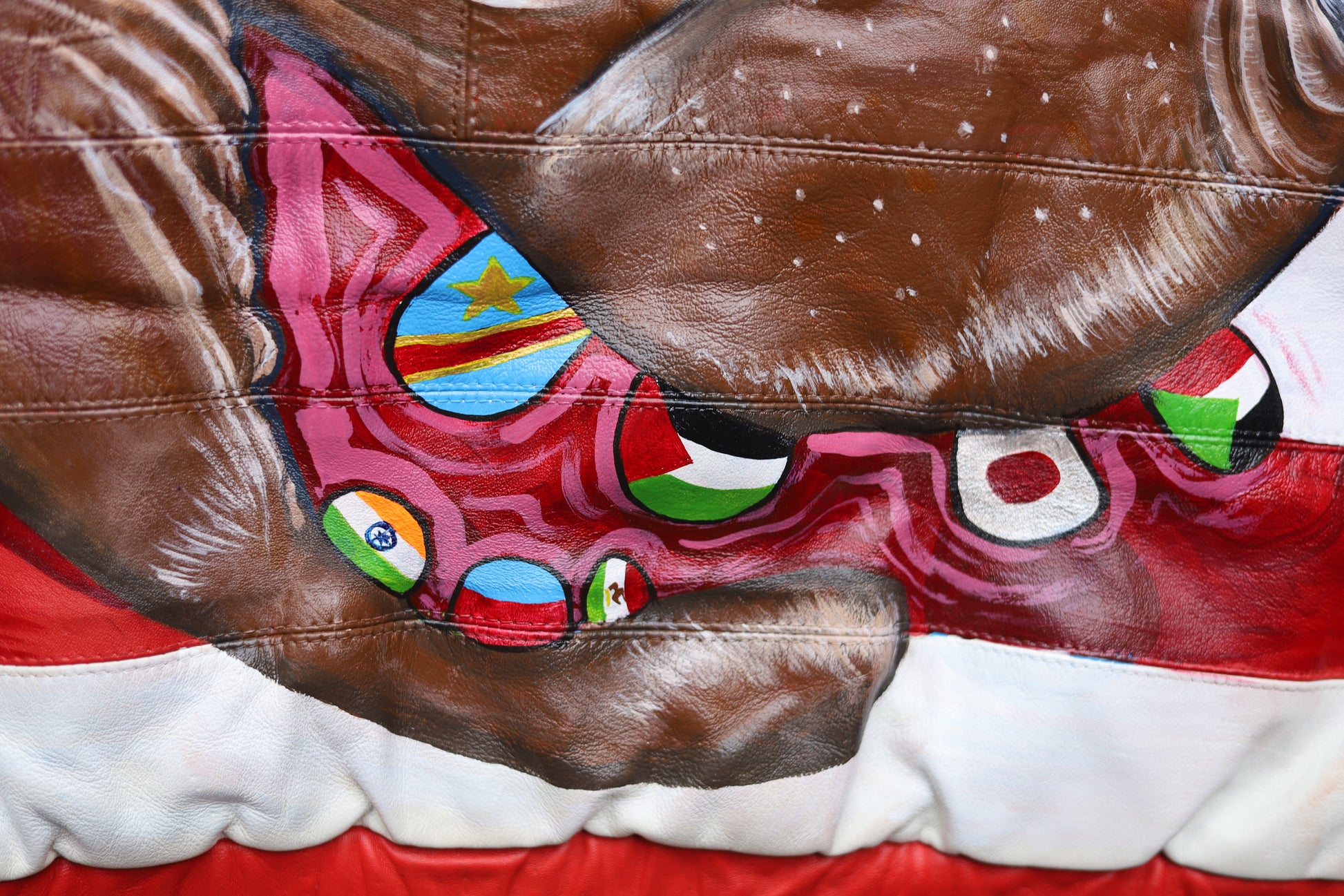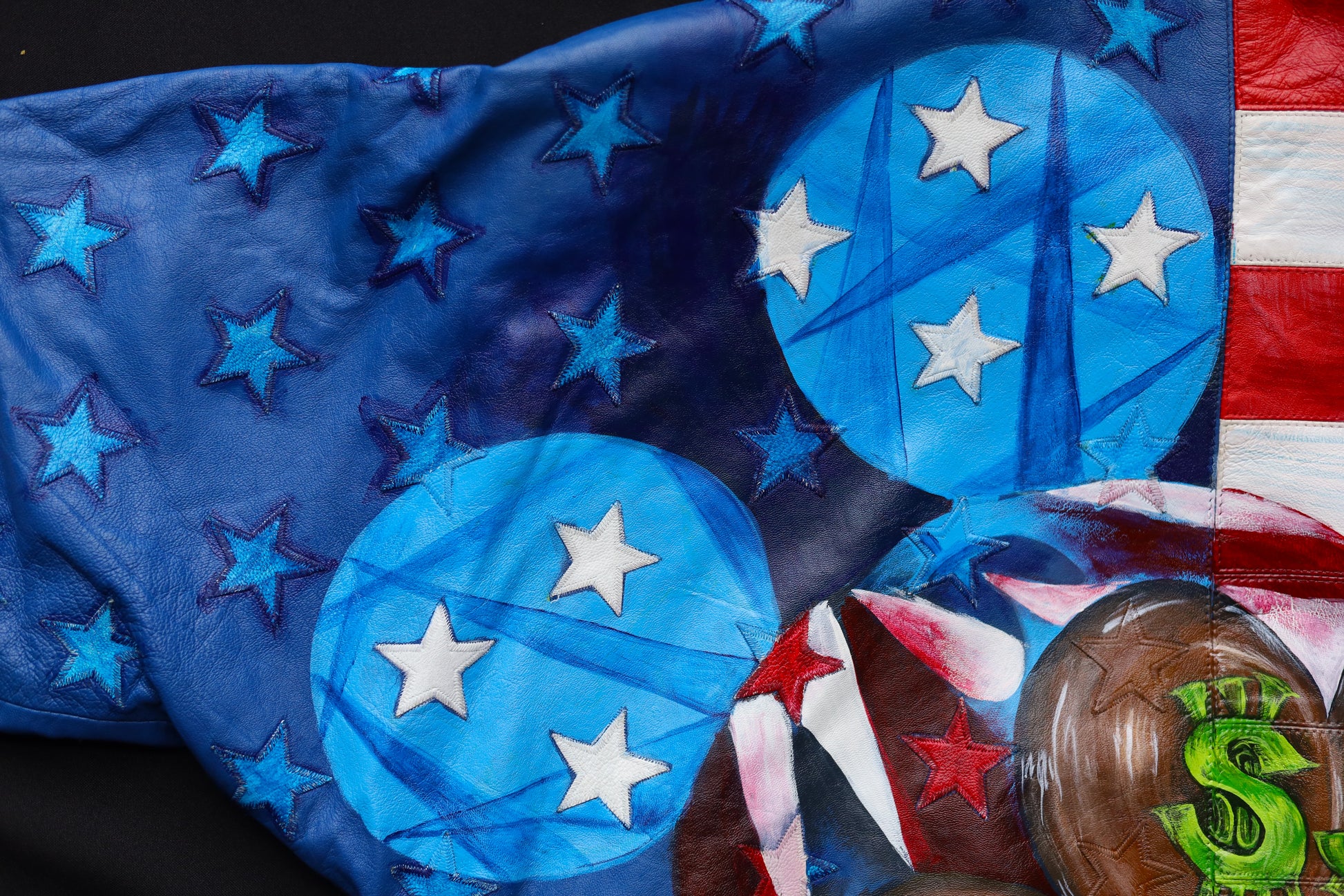 A hand painted 1 of 1 faux leather jacket, size XL. Weather-proofed, vintage jacket. Order comes with a hand dyed, red white & blue dust bag to match.